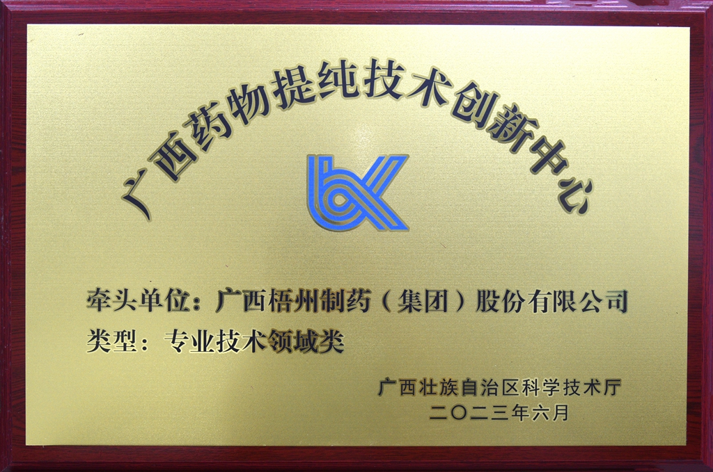 廣西梧州制藥(集團(tuán))股份有限公司在專業(yè)技術(shù)領(lǐng)域類獲評(píng)廣西藥物提純技術(shù)創(chuàng)新中心