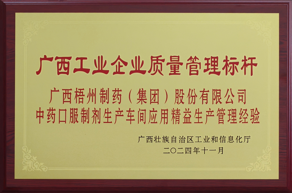 廣西梧州制藥(集團(tuán))股份有限公司(中藥口服制劑生產(chǎn)車間應(yīng)用精益生產(chǎn)管理經(jīng)驗(yàn))榮獲廣西工業(yè)企業(yè)質(zhì)量管理標(biāo)桿